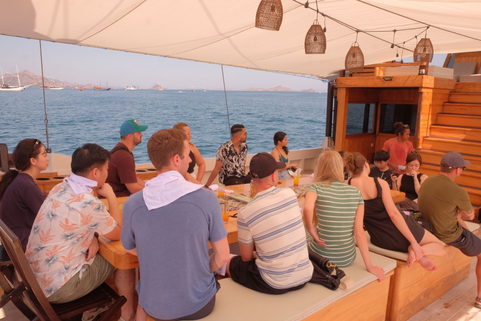 The boat leaves the harbor. As we cruise past the small islands scattered around Labuan Bajo, enjoy the view from the sun deck with light snacks served on board.
