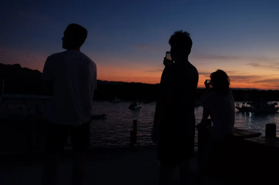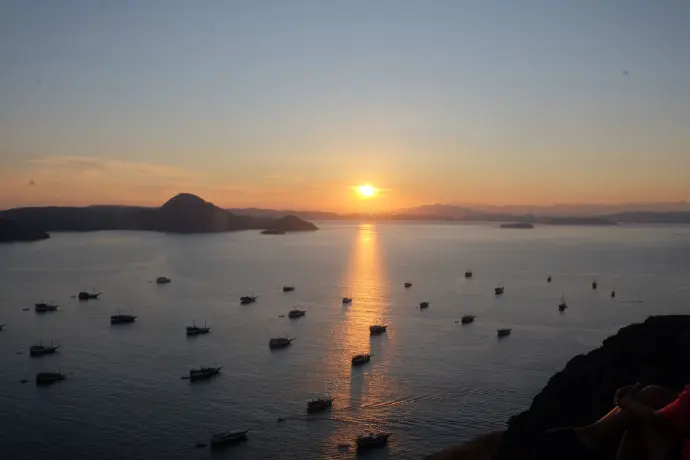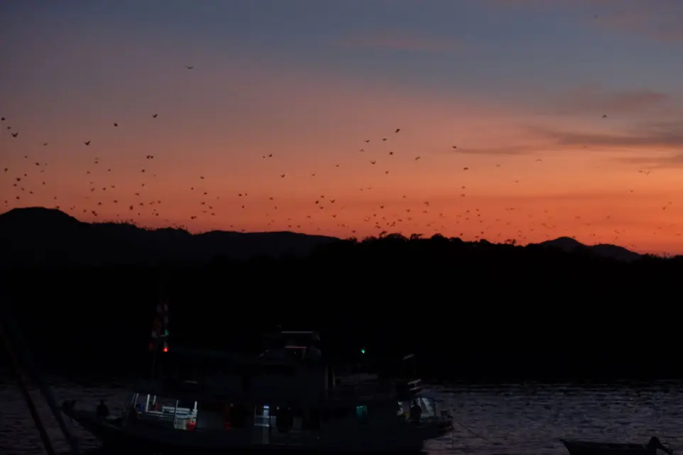 As sun sets, the boat anchors near Kalong Rinca. Here, thousands of flying foxes (giant bats) soar out of the mangroves into the night sky. Watching their silhouettes against the sunset is an unforgettable natural spectacle.