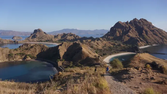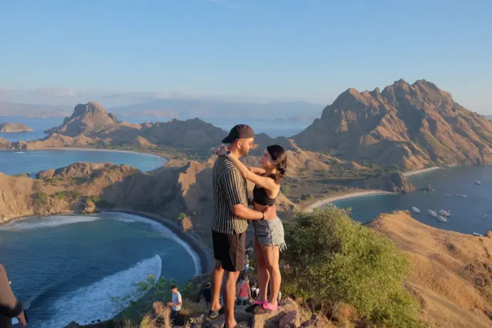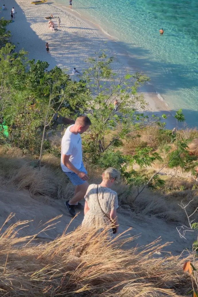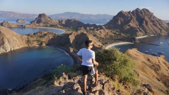The trek to the top is short but steep, and once you reach the summit, you’ll be rewarded with one of Indonesia’s most iconic views — three crescent-shaped bays with different colored sands: white, black, and pink. This view alone makes the whole trip worthwhile.