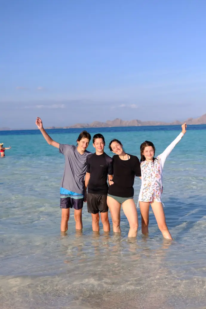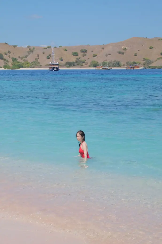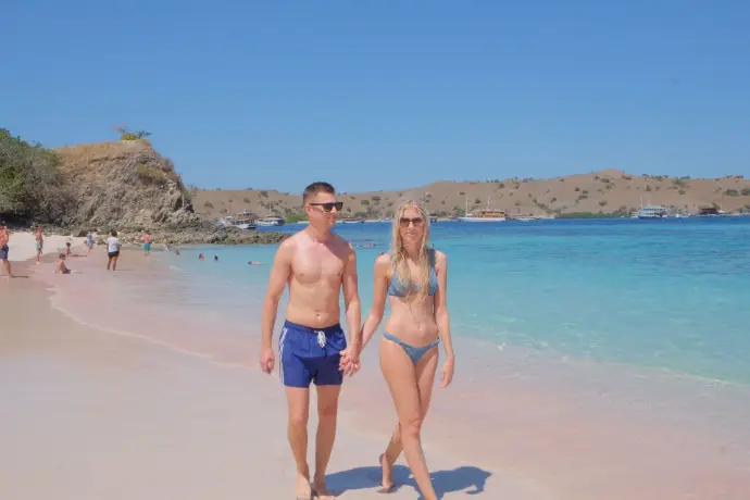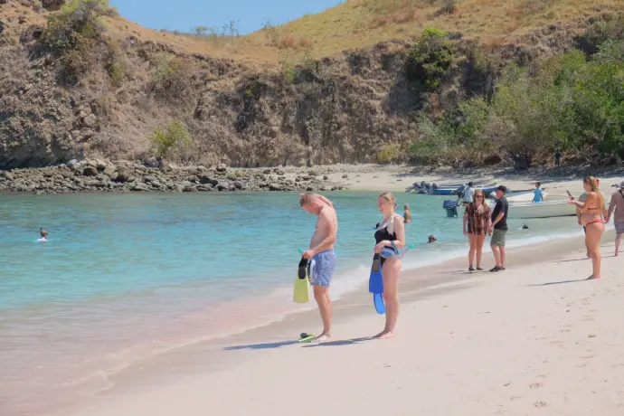 After the trek, the boat takes you to Pink Beach, famous for its blush-colored sand created by tiny fragments of red coral.