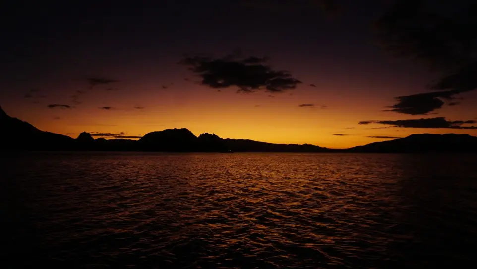 As darkness approaches, dinner is served on board. The colors of the sky slowly shift from gold to deep orange, and finally to star-filled darkness.